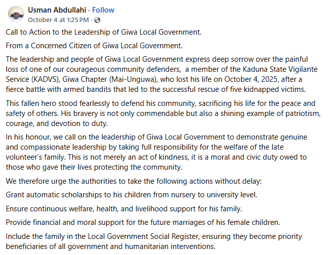 Meanwhile, on Monday, October 6, the chairman of Giwa Local Government, Hon. Ahmad Samaila Abdullahi Yakawada, paid a condolence visit to the family of the gallant commander.